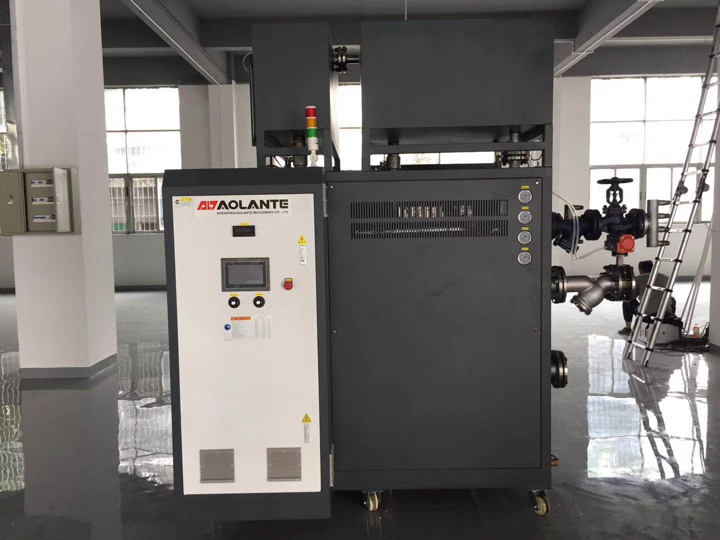 碳纖維復(fù)合材料行業(yè)控溫速冷速熱模溫機在河北客戶生產(chǎn)防彈衣、防彈頭盔使用現(xiàn)場。